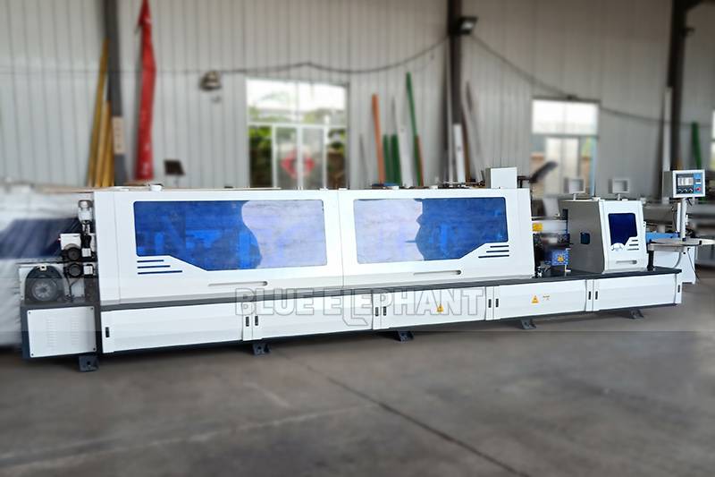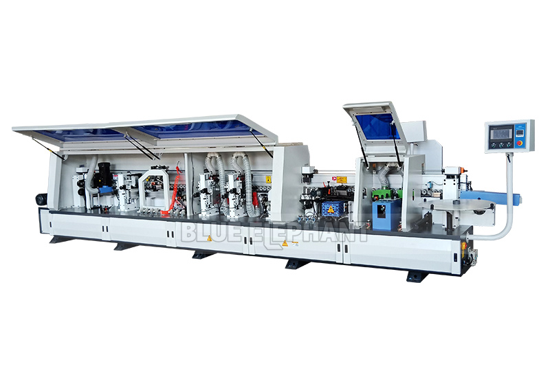 2、全自动封边机具有:抛光2—抛光1—开槽—平刮—刮边—跟踪修边—精修—粗修—齐头齐尾—涂胶封边—预铣。
